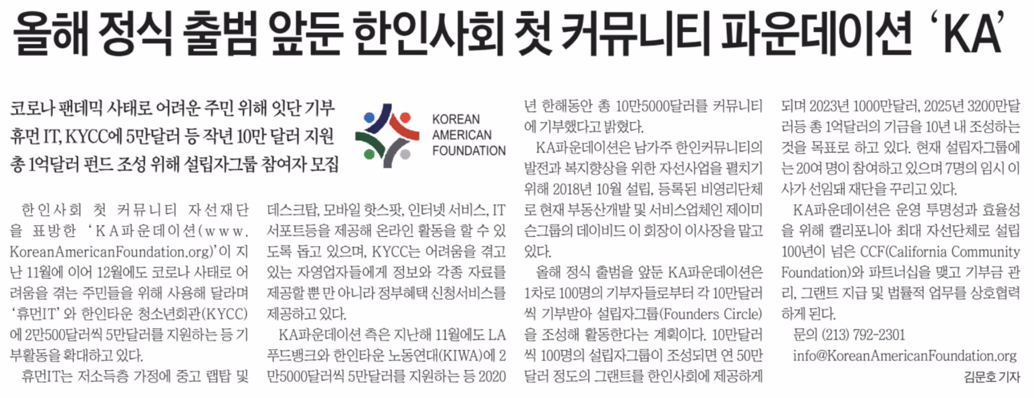 코로나 팬데믹 사태로 어려운 주민 위해 잇단 기부 휴먼 IT, KYCC에 5만달러 등 작년 10만 달러 지원 총 1억달러 펀드 조성 위해 설립자그룹 참여자 모집